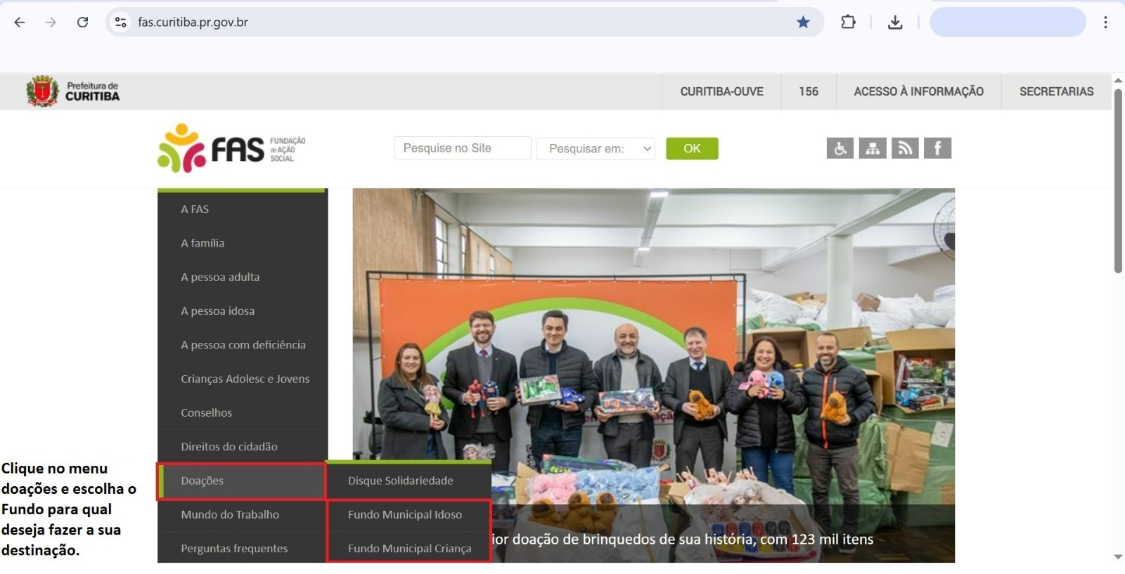 Acesse o site fas.curitiba.pr.gov.br, vá até o menu lateral esquerdo e clique em “Doações”. Em seguida, selecione Fundo Municipal do Idoso ou Fundo Municipal da Criança.
