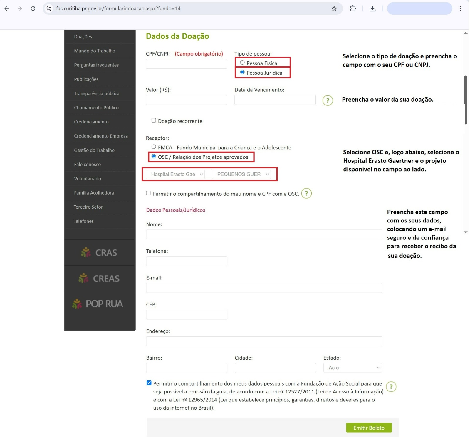 Acesse o site fas.curitiba.pr.gov.br, vá até o menu lateral esquerdo e clique em “Doações”. Em seguida, selecione Fundo Municipal do Idoso ou Fundo Municipal da Criança